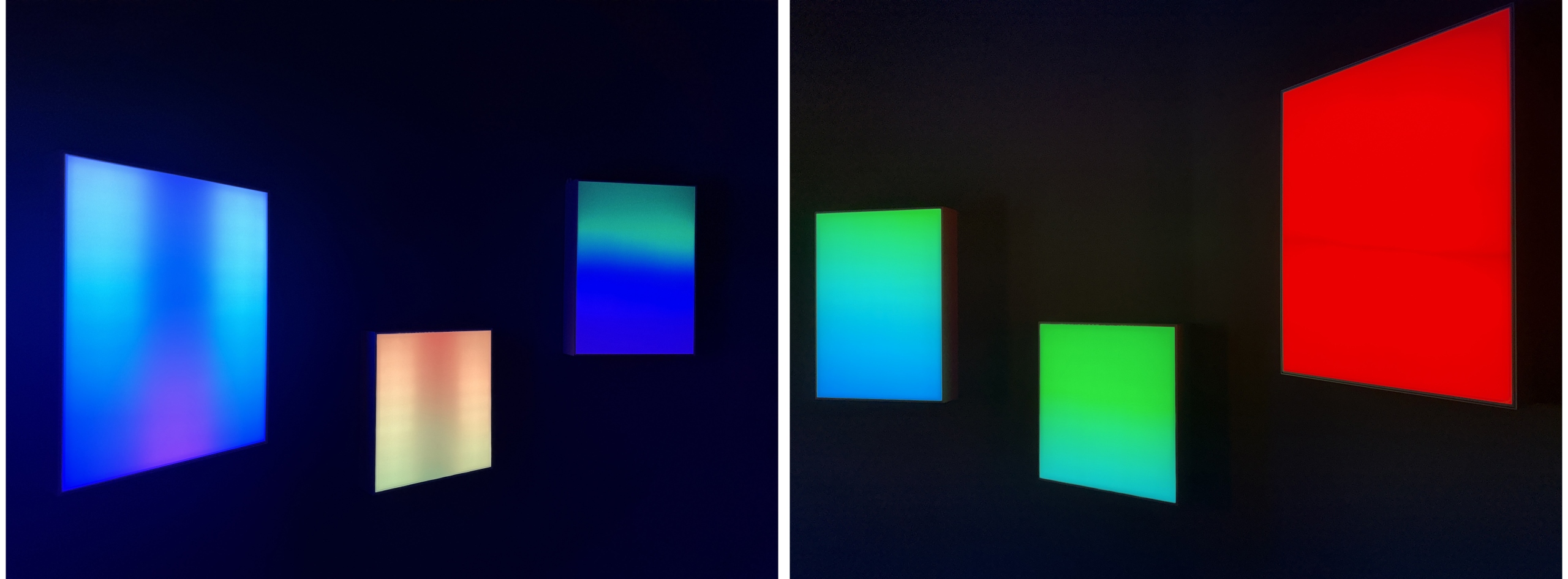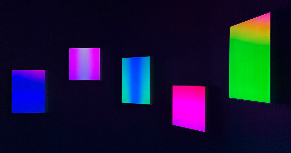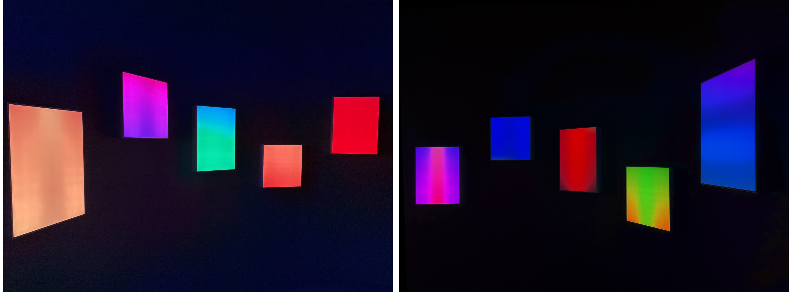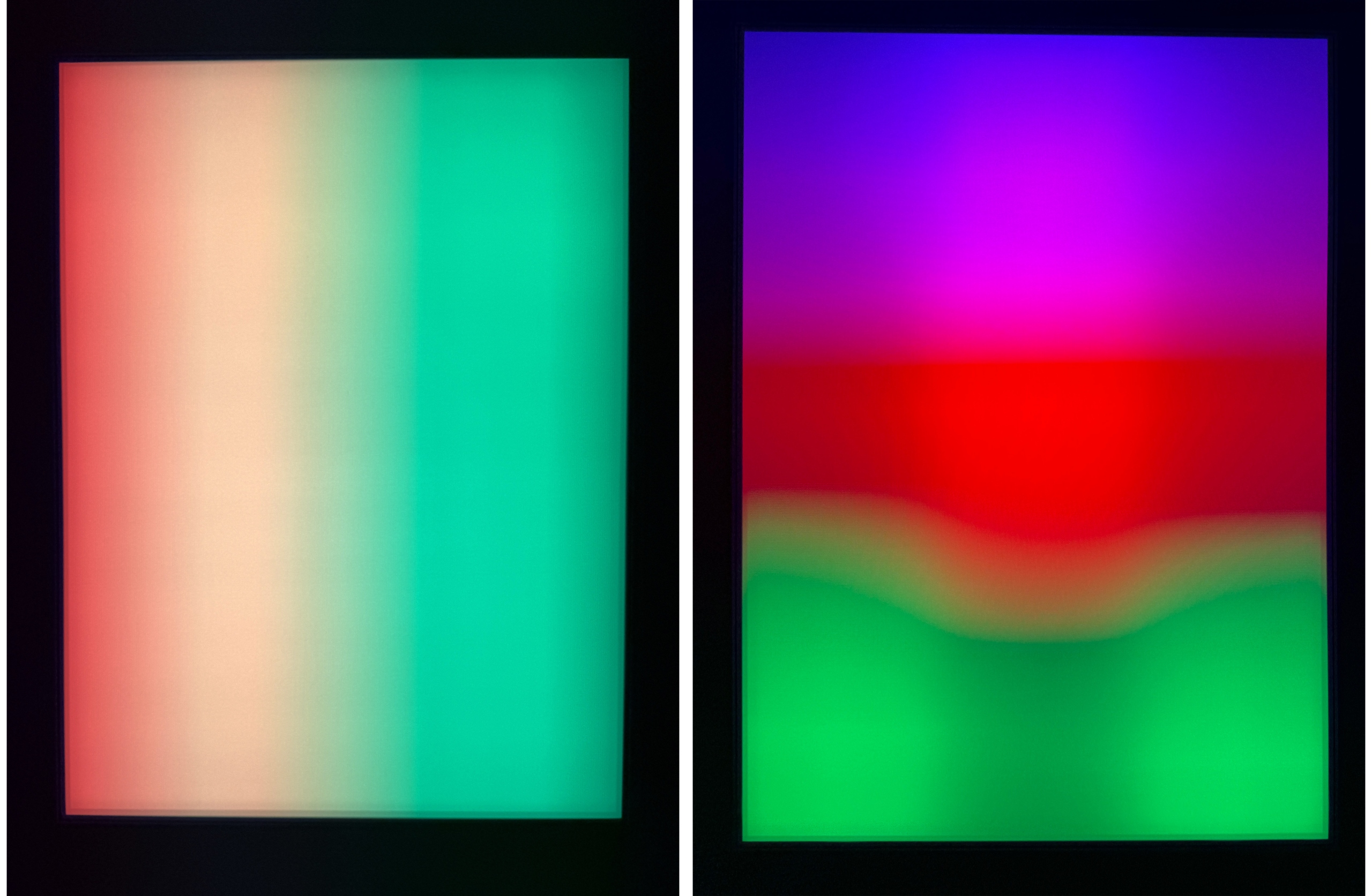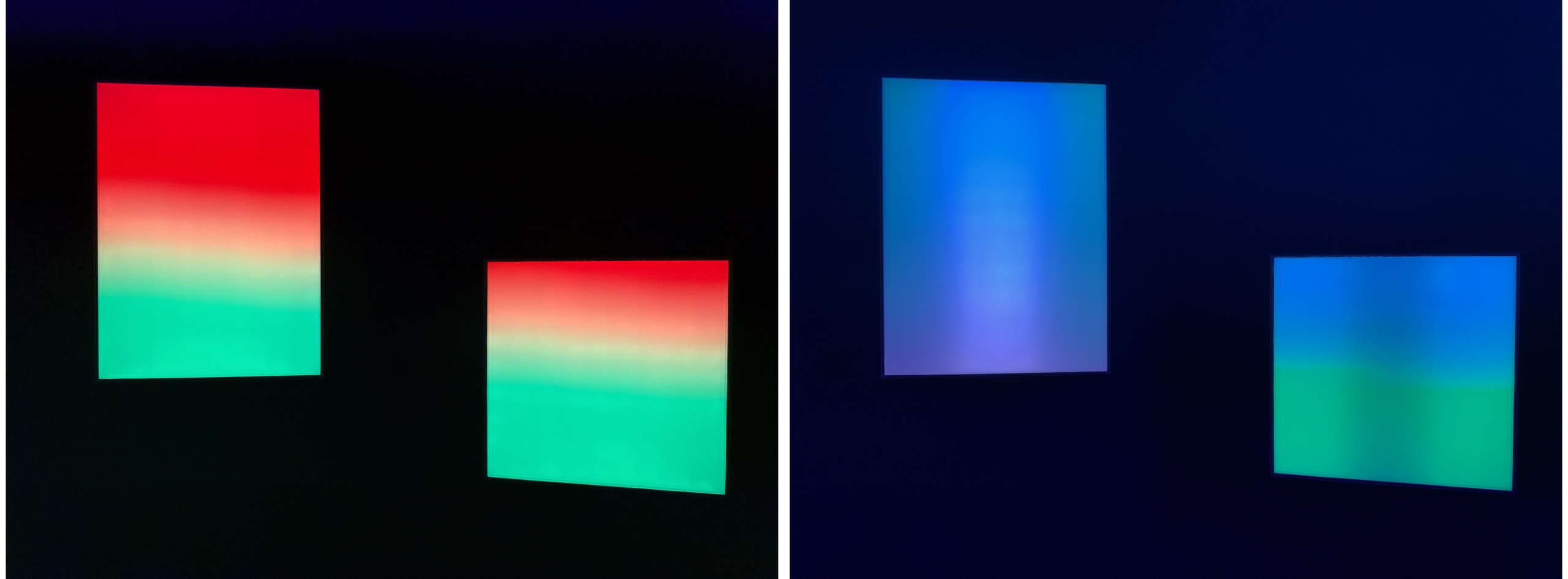 To the naked eye, the work appears simply as a glowing white panel. Yet when viewed through a smartphone camera, bands of vibrant color emerge across the screen.