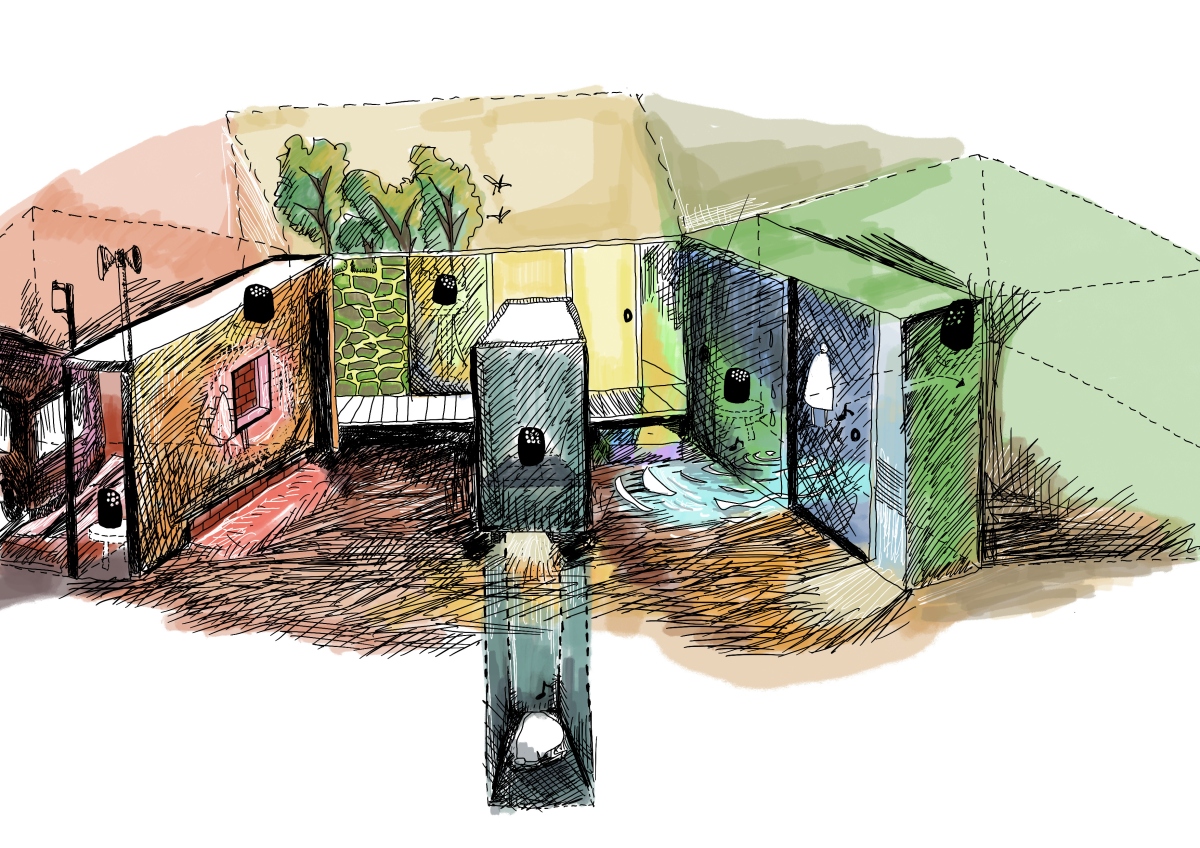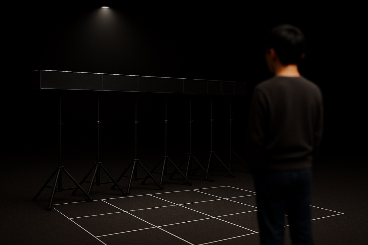鑑賞者の位置や歩行に応答して音場が変化するインタラクティブ音響システムを用いたサウンドインスタレーション。