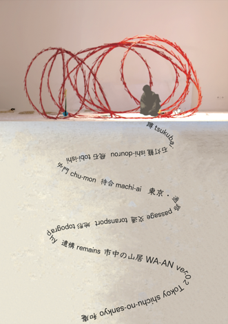立ち上がる。茶室は、空間的移行としての「露地」と、精神的転換としての「山居」の二つの次元によって成り立ち、「市中の山居」は、日常「市中」から茶の湯の清浄な世界へと段階的なアプローチを持つ。「アースダイバー」*的リサーチにより、この場所周辺の建築・通路・交通・地形・遺構を、茶の「露地空間」や「市中の山居」として「見立て」、人は時空を超えて、橋上の「和WA」の庵へと至る。散会後、橋を渡り古層の庭も散策する。物質を伴うインスタレーションは保管、廃棄の問題もある。「南京玉すだれ」の構造システムと竹の菜箸を利用したトランク1つで旅する「WA-AN和庵」(磯崎新レガシー/テヘラン「間」展出品)のバージョン2.0は、東洋竹工の加工・漆塗装技術とのコラボにより総朱漆塗りとなり、「市中の山居」として各地で出現と消失を繰り返す。(WAは平和/和する/和む/の意)(*中沢新一著作名)