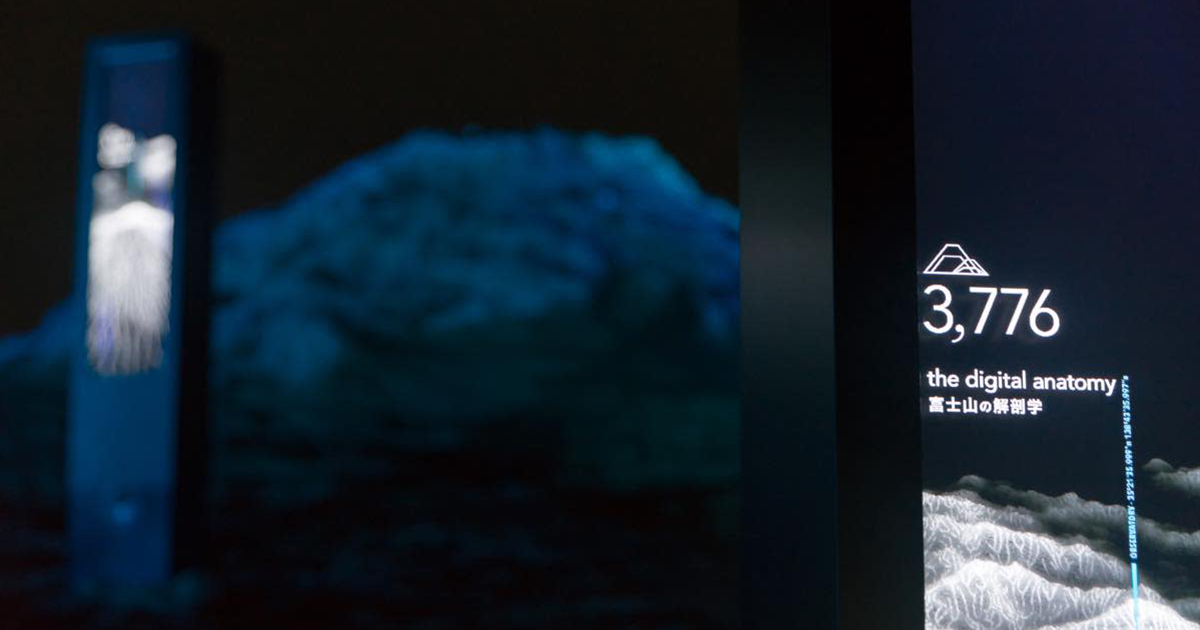 Rhizomatiks Architectureが空間演出を行う「3776:the digital anatomy~富士山の解剖学~」は、富士山にまつわる多様な研究データをビジュアライズし、西畠清順氏が制作した高さ約6m、幅約23mのモニュメント「江戸富士」上に表現した屋外インスタレーション。3Dデータによる特設サイトも制作している。