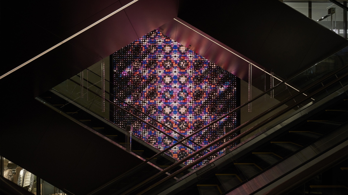 2019年9月20日にグランドオープン「大丸心斎橋店 北館」その本館中央に位置するエスカレータ空間(1F〜10F)を貫く、幅4m×高さ50mの大型インスタレーション「D-WALL」。80年以上もの長きに渡って、心斎橋店のアイコンであったヴォーリズ建築の天井や柱に施されたステンドグラスの造形美を、彫刻と映像の融合により再構築した。