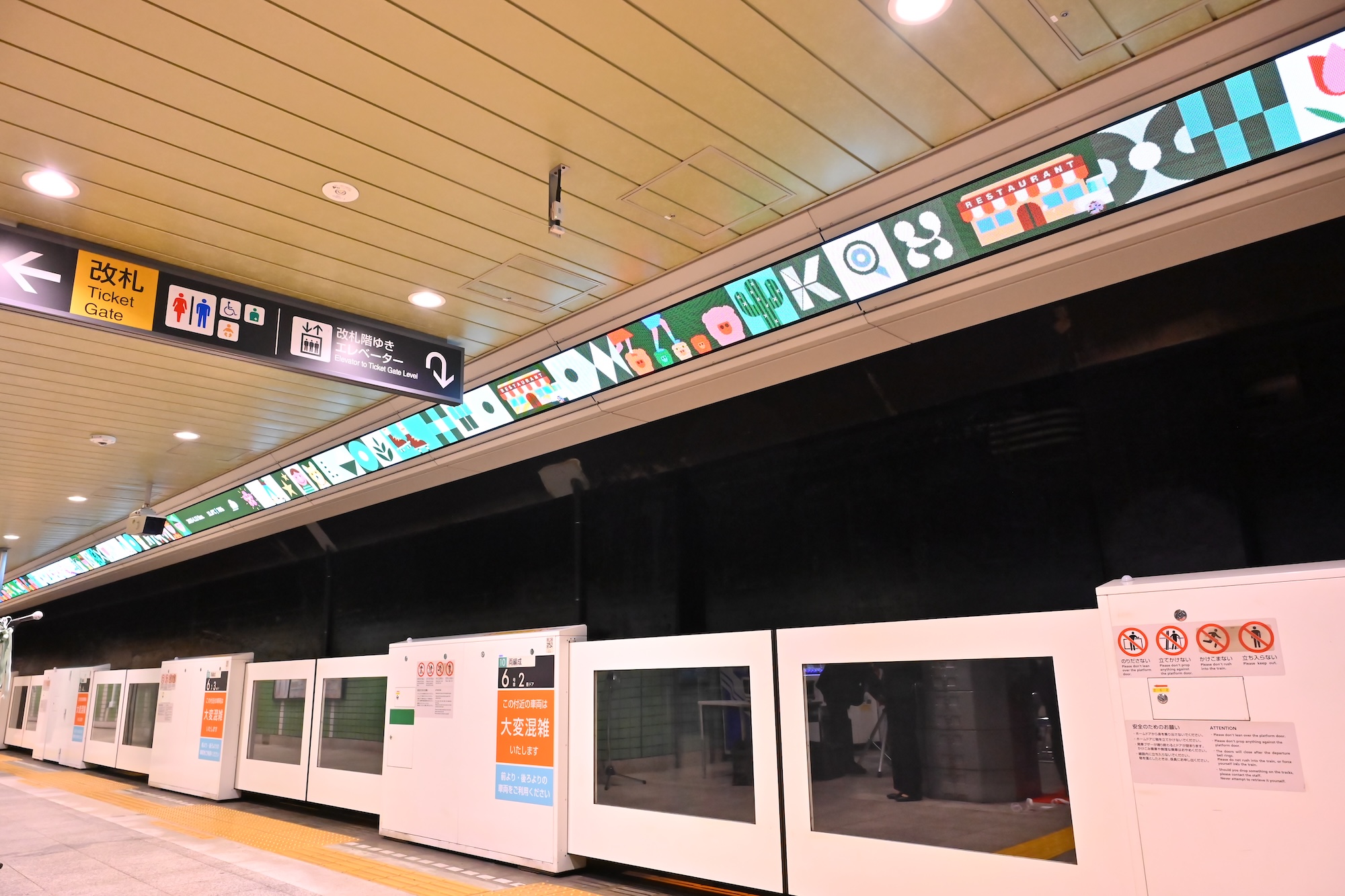 上下線ホーム2箇所に設置されたRAILWAY VISIONは全長90m、周辺環境と連動するコンテンツ放映は日本初の取り組みです。