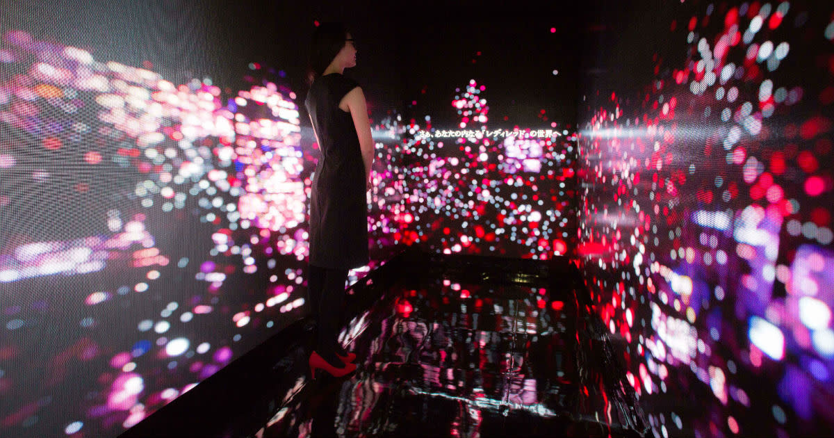1Fには高精細LEDビジョンに囲まれた空間を設計し、商品のテーマである「LADY RED」をモチーフにした数十パターン映像を用意。センサー搭載のアイウエア「JINS MEME」で来場者のココロとカラダを読み取り、その人の状態によって違う映像を投影した。