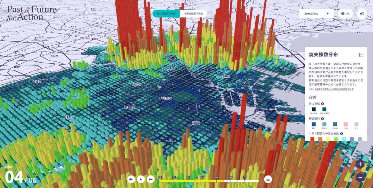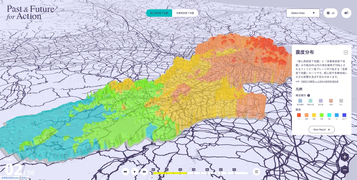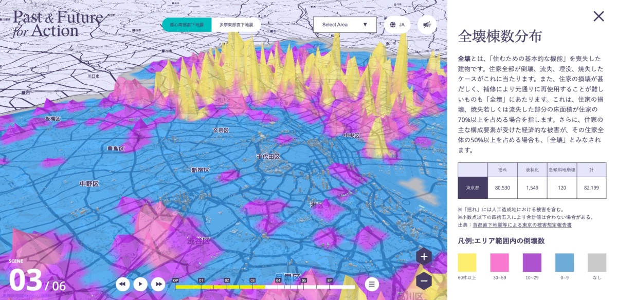 ストーリーは現在の東京の姿から、都心南部直下地震もしくは多摩東部直下地震が発生した際の「震度」「全壊棟数」「焼失棟数」「液状化」を描きます。Project PLATEAUの3D建築物データと、災害・防災に関するオープンデータを掛け合わせたデータビジュアライズは、WebGISエンジンだからこそ実現できる表現となりました。