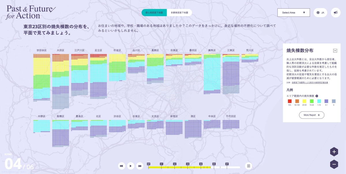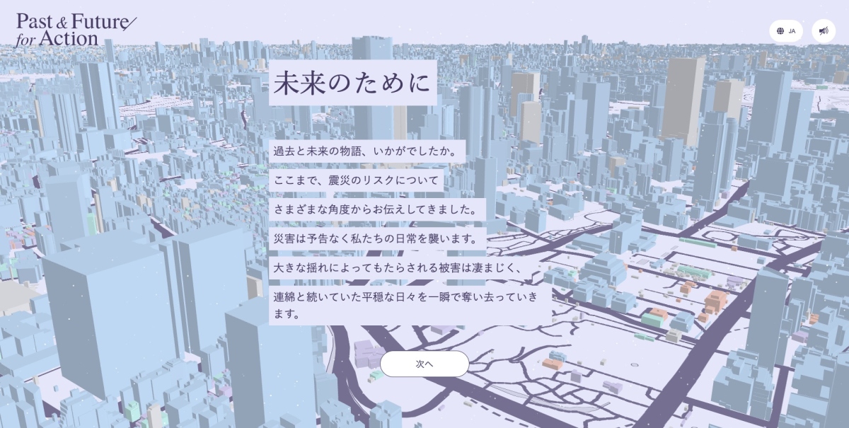 コンテンツは公助における取り組みをエピローグとして終わりを迎えます。今回このコンテンツで表現した被害想定は、東京という大都市の実情をなるべくリアルに映し出すべく算出されたデータを元にしていますが、仮説には常に例外があります。自然災害というものは、その性質上、予測困難な要素を抱えています。未来が不確かだからこそ想定された結果だけにとらわれず、いつ、どんな条件下で起きるかわからない大規模地震にそなえて、自助・共助・公助すべての力を結集して大規模地震に立ち向かっていくべきではないか、ということをメッセージに込めています。