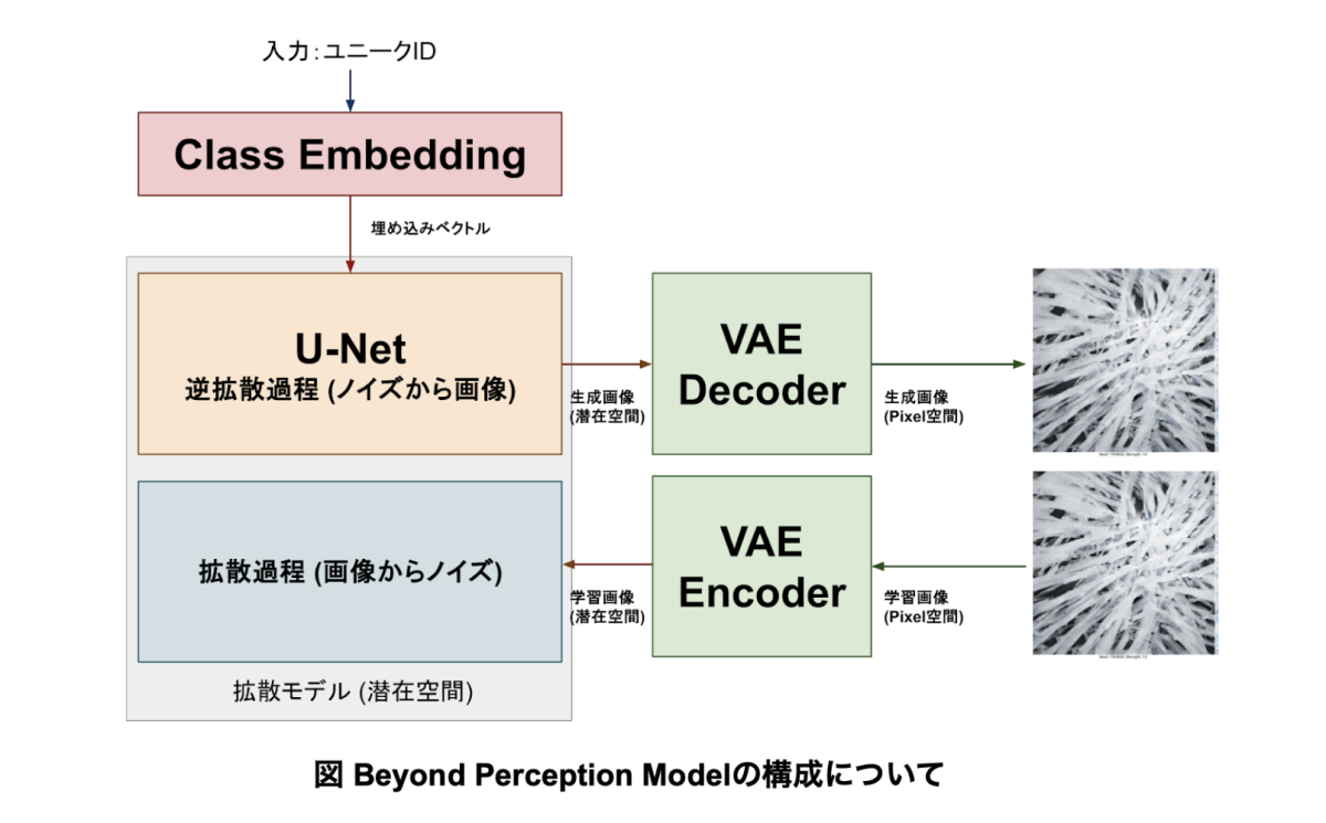 U-Netの学習は、256×256ピクセルという低解像度で学習を開始し、徐々に高解像度に移行するような形で学習を行い、最終的には896×512ピクセルでの画像生成が可能となった。これらの学習プロセスでは、パラメータを微調整しながら複数回の学習を実行した。そして、合計8回の学習プロセスをつなぎあわせることで、最終的な「Beyond Perception Model」が完成した。