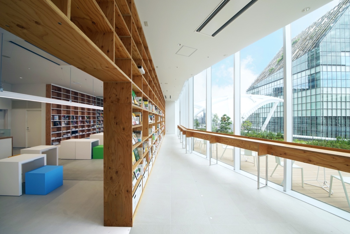 ららぽーと豊洲3 4Fにある自然光がたっぷり入る、ブックラウンジ「SPBS TOYOSU」の企画から内装デザインを担当した。