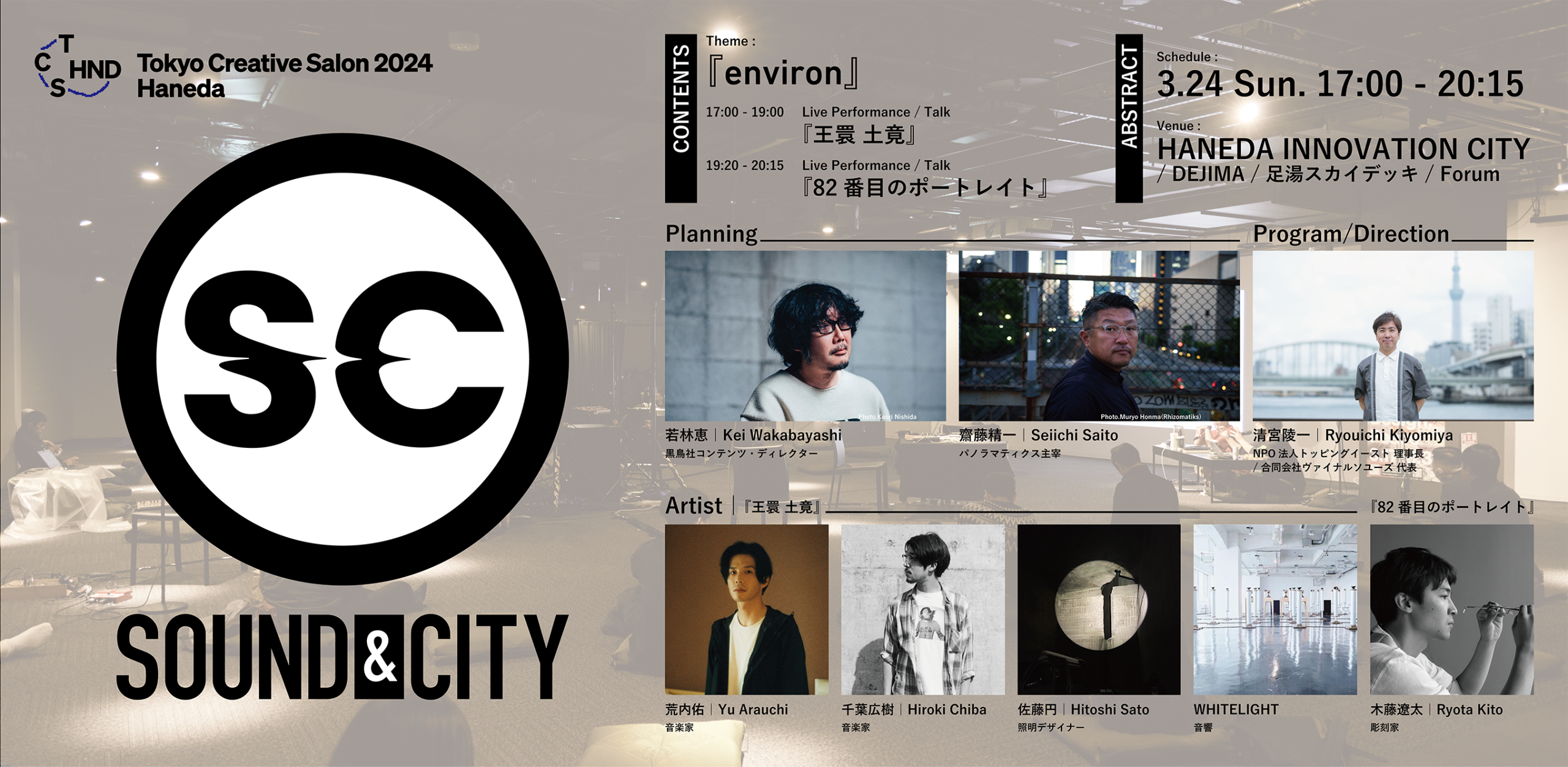 昨年度のTCSでも開催し、好評を博した、音楽と都市の在り方を再考するイベント”Sound&City”。今回のテーマは”environ”。我々を「取り巻く」音楽や光、そして音響、空間といったさまざまな領域で活躍されている方々をお迎えして、パフォーマンスとトークをお届けいたします。